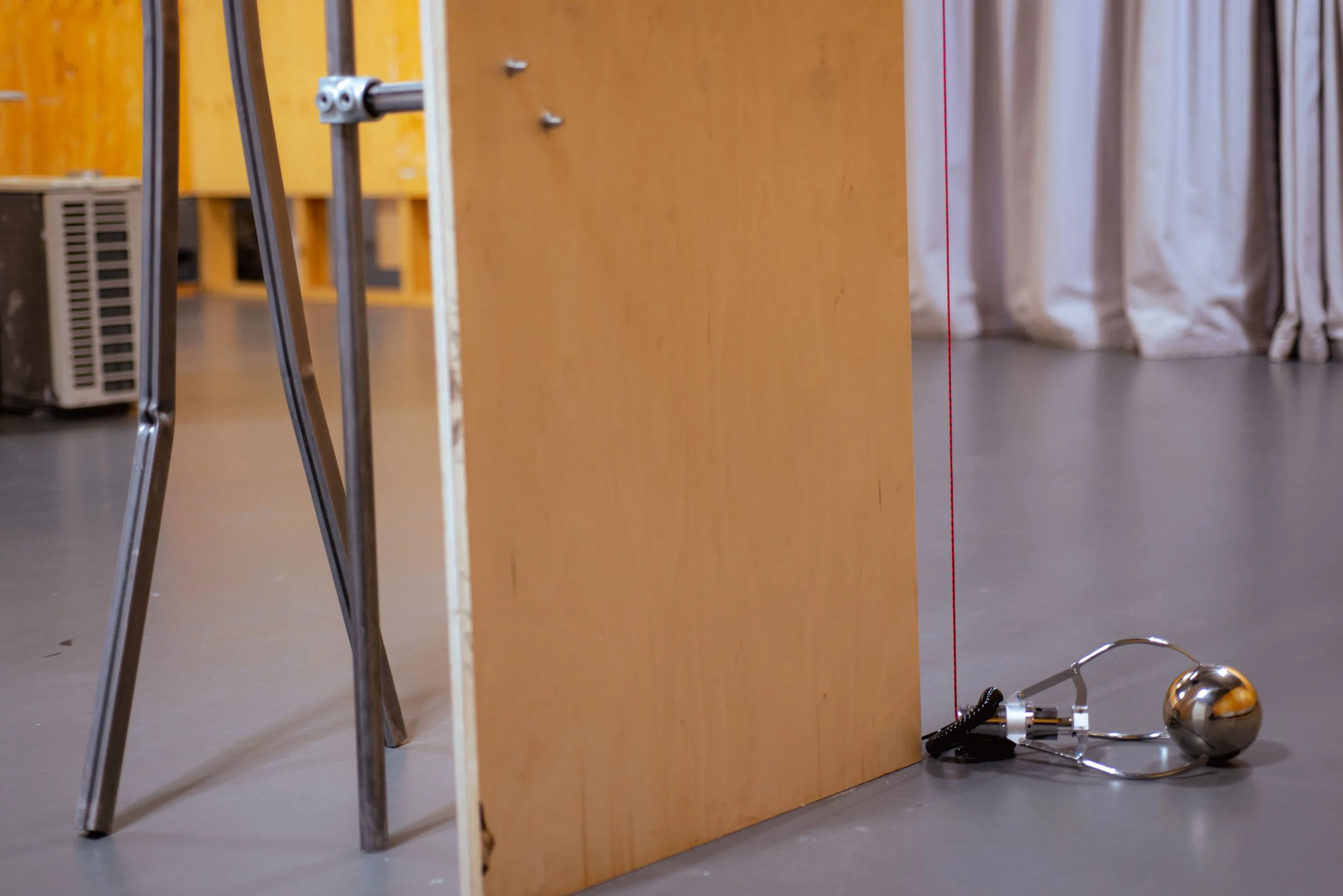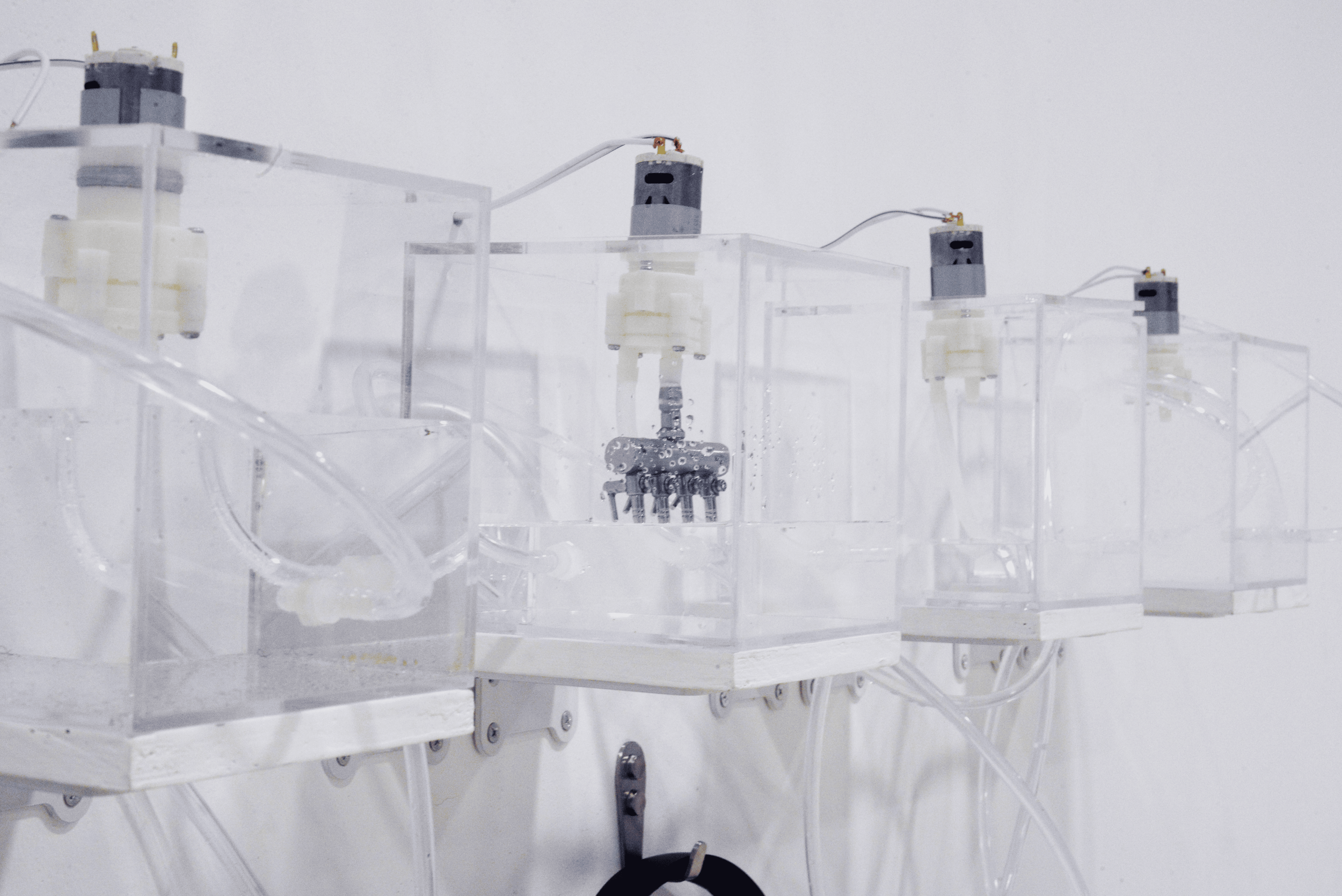 Cubes en plexiglas reliés par des tuyaux. Équipé de pompes, le système permet une gestion du flux de l’eau assurant une circulation fluide du liquide entre les cubes. Des capteurs piézoélectriques sont intégrés à chaque cube pour diffuser l’audio retraité dans les casques